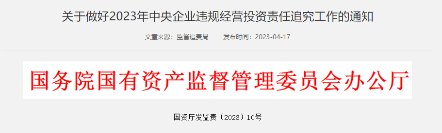 4月17日,國資委監(jiān)督追責(zé)局發(fā)布《關(guān)于做好2023年中央企業(yè)違規(guī)經(jīng)營投資責(zé)任追究工作的通知》(簡稱“通知”)。