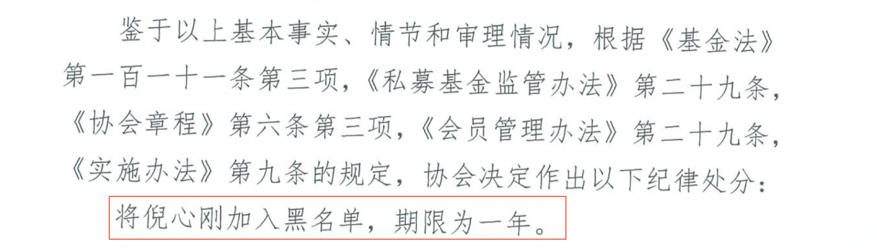 根據(jù)中基協(xié)披露的對(duì)倪心剛的紀(jì)律處分決定書,協(xié)會(huì)決定將倪心剛加入黑名單,期限為一年。