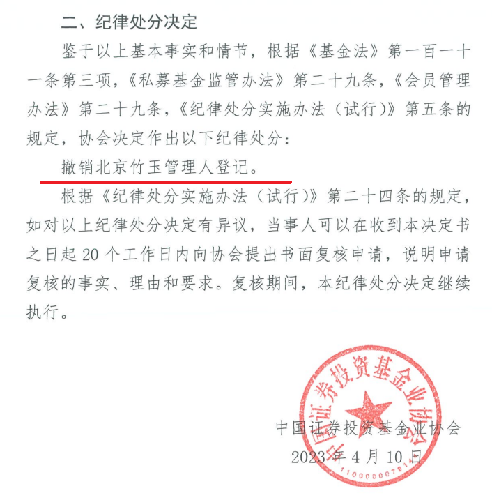 經(jīng)查,北京竹玉存在四大違規(guī)行為,分別是產(chǎn)品募集完畢后未按規(guī)定向協(xié)會(huì)備案、從事與私募基金無關(guān)的業(yè)務(wù)、未及時(shí)向協(xié)會(huì)報(bào)送相關(guān)信息、且已不具備持續(xù)經(jīng)營(yíng)的條件。鑒于以上基本事實(shí)和情節(jié),中基協(xié)決定撤銷北京玉竹管理人登記。