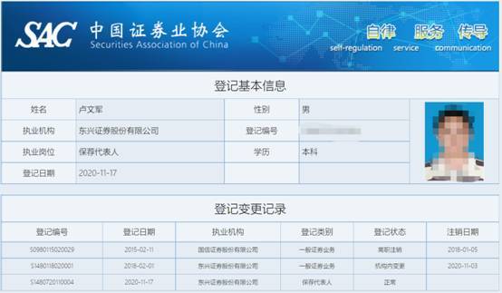 中國證券業(yè)協(xié)會公開資料顯示,覃新林的執(zhí)業(yè)機構(gòu)為東興證券股份有限公司,執(zhí)業(yè)崗位保薦代表人,登記日期為2016年2月29日至今。盧文軍的執(zhí)業(yè)機構(gòu)為東興證券股份有限公司,執(zhí)業(yè)崗位保薦代表人,登記日期為2020年11月17日至今。