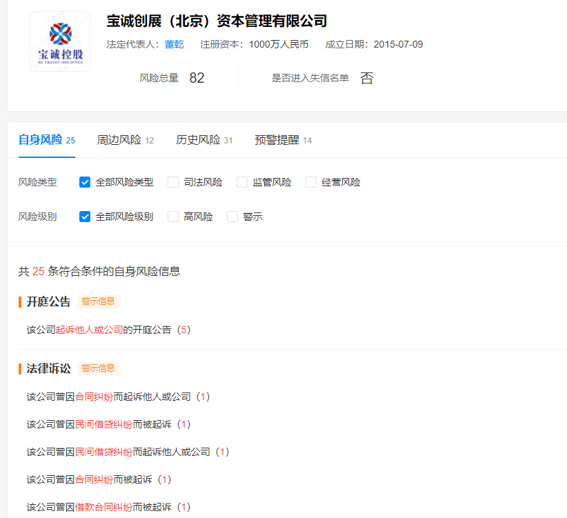 銀柿財(cái)經(jīng)通過天眼查發(fā)現(xiàn),寶誠創(chuàng)展同時(shí)也是一家被提示有較多風(fēng)險(xiǎn)的公司,曾因合同糾紛、民間借貸糾紛等起訴他人或公司,也曾因相關(guān)糾紛被起訴。