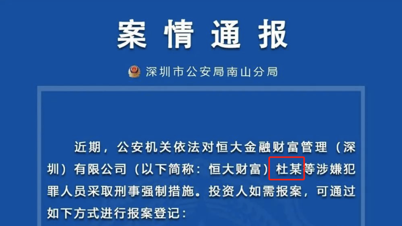 據(jù)消息報道,許家印在本月初,就已經(jīng)被警方帶走,被安置在北京某指定地點接受監(jiān)視。這是恒大債務爆雷以來,許家印本人首次被警方采取人身限制措施。在許家印被監(jiān)控之前,恒大財富多名高管被深圳市公安局刑事逮捕。警方披露的杜某,應該是恒大財富總經(jīng)理:杜亮。