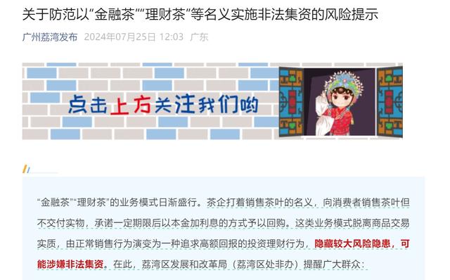 7月25日,芳村所屬的廣州荔灣發(fā)文提醒關(guān)于“金融茶”“理財(cái)茶”的風(fēng)險(xiǎn)。