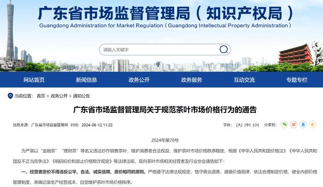 為嚴(yán)禁以“金融茶”“理財(cái)茶”等名義違法炒作銷售茶葉,廣東省市場(chǎng)監(jiān)管局6月份曾發(fā)布關(guān)于規(guī)范茶葉市場(chǎng)價(jià)格行為的九條通告。