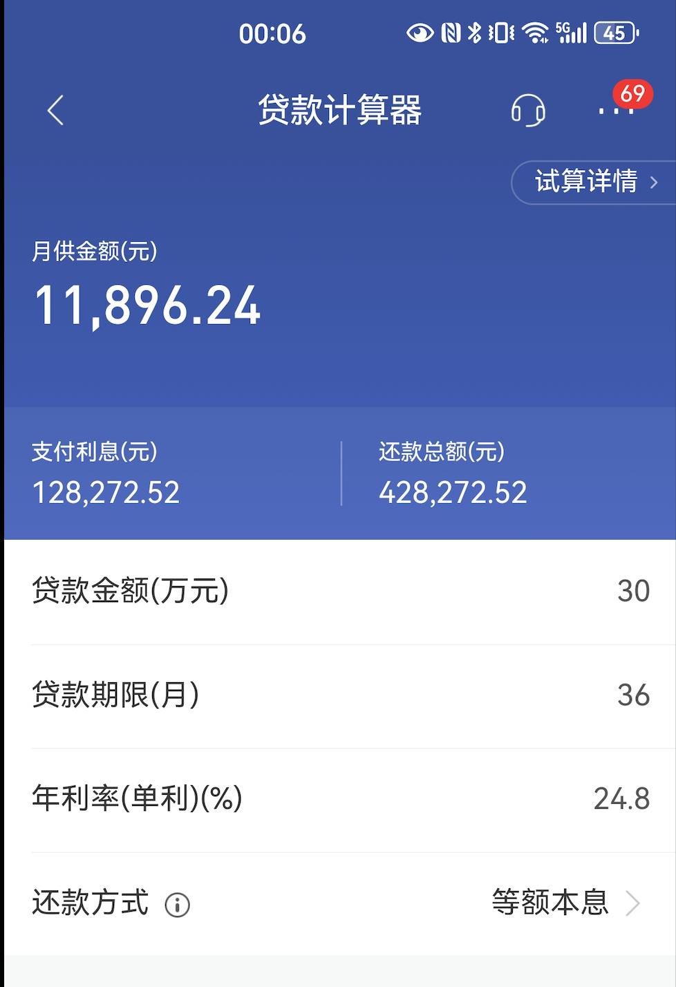 若加上保費,李明貸款的綜合成本超過了24%。圖片來源/銀行貸款計算器截圖