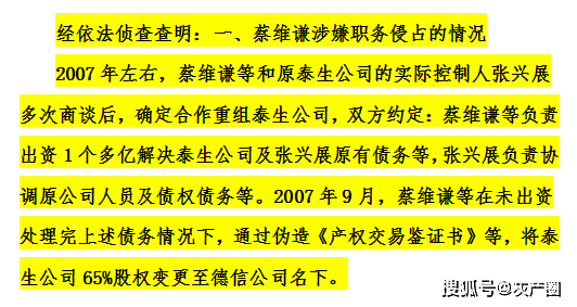 根據(jù)深圳檢方審查查明的情況,蔡維謙在2007年與張興展商談“合作重組泰生公司”之事;2008年,蔡維謙所控制的德信物業(yè)(武漢)發(fā)展有限公司(下稱“德信公司”),對泰生公司進行重組,由蔡維謙擔任法定代表人。