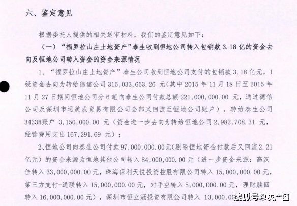 筆者注意到,深圳警方委托的會計師事務所《司法會計鑒定意見書》鑒定意見(一)顯示:“福羅拉山莊土地資產(chǎn)”泰生公司收到恒地公司支付的包銷款3.18億元,1級資金去向為轉(zhuǎn)給德信公司31503萬余元(其中2015年11月18日至27日期間恒地公司分6筆向泰生公司付款22100萬元,通過德信公司及深圳市運美成貿(mào)易有限公司全部又回流至恒地公司賬戶),轉(zhuǎn)給泰生公司3433號賬戶315萬元(資金進一步去向為轉(zhuǎn)給恒地公司298萬余元,經(jīng)營費用支出16萬余元)。
