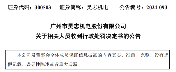 大河財(cái)立方消息,12月30日,A股上市公司——廣州市昊志機(jī)電股份有限公司(證券簡(jiǎn)稱(chēng)昊志機(jī)電)發(fā)布公告稱(chēng),該公司控股股東、實(shí)際控制人、董事長(zhǎng)湯秀清,公司董事、董事會(huì)秘書(shū)、副總經(jīng)理、財(cái)務(wù)總監(jiān)肖泳林收到證監(jiān)會(huì)的《行政處罰決定書(shū)》。