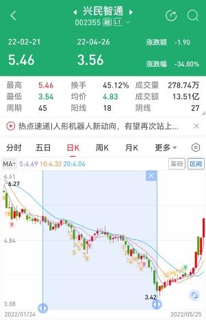 行情數(shù)據(jù)顯示,興民智通股價(jià)在宣布終止重組后一路震蕩下行,2022年2月下旬至4月下旬,大約兩個(gè)月時(shí)間,從5.46元/股跌至3.56元,累計(jì)跌幅接近35%。