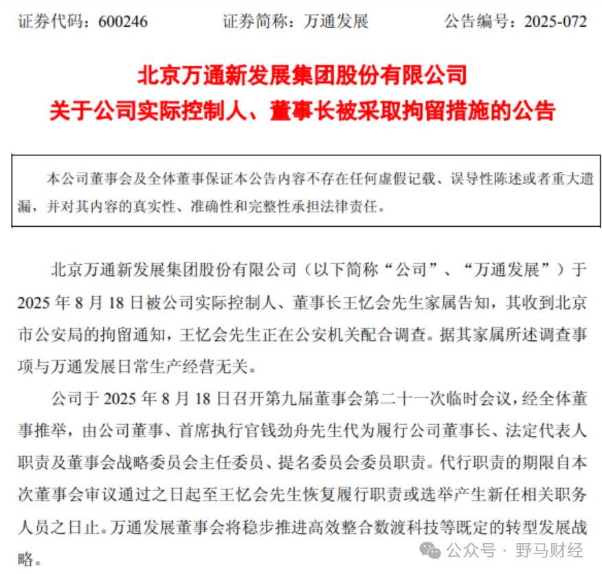 萬通發(fā)展公告稱,家屬透露,王憶會協(xié)助調(diào)查與公司日常生產(chǎn)經(jīng)營無關(guān),但具體涉案原因仍迷霧重重。