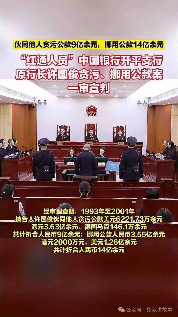 經(jīng)審理查明,1993年至2001年,許國俊利用擔(dān)任中國銀行開平支行辦公室主任、副行長、行長等職務(wù)便利,伙同許超凡、余振東等人,采用辦理虛假貸款套取銀行資金、占用公司正常還貸資金或直接轉(zhuǎn)款等手段,貪污公款美元6221.73萬余元、港元3.63億余元、德國馬克146.1萬余元,折合人民幣9億余元;挪用公款人民幣3.55億余元、港元2000萬元、美元1.26億余元,折合人民幣14億余元,貪污數(shù)額特別巨大,并使國家和人民利益遭受特別重大損失,挪用公款數(shù)額巨大。