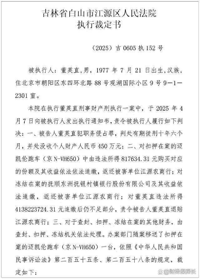 吉林省一紙執(zhí)行裁定書近日引發(fā)金融地震!江源農(nóng)商行原董事長(zhǎng)董英直被曝在任5年間,通過(guò)系列"神操作"從銀行套取41.38億元巨資,這個(gè)相當(dāng)于該行注冊(cè)資本13倍的天文數(shù)字,不僅刷新了農(nóng)商系統(tǒng)腐敗案記錄,更暴露出令人心驚的監(jiān)管漏洞。當(dāng)這份載明具體作案金額的司法文書被公開時(shí),整個(gè)銀行業(yè)都為之震動(dòng)。