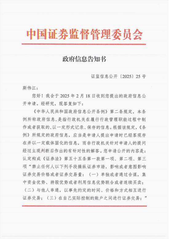 2025年3月18日,被告作出“證監(jiān)信息公開〔2025〕25號”《政府信息告知書》,認為:“您提出的政府信息公開申請實質(zhì)為我會對操縱證券市場法律要件的理解和適用的咨詢,不屬于《條例》所規(guī)定的政府信息公開范疇。”原告對此《政府信息告知書》提起復(fù)議。