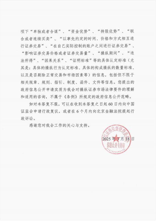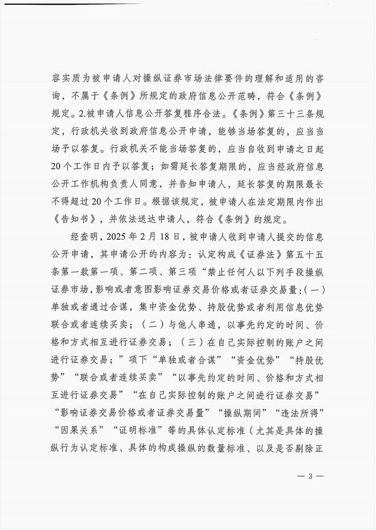 2025年2月17日,原告向被告提出政府信息公開申請,要求公開:認定構(gòu)成《證券法》第五十五條第一款第一項、第二項、第三項“禁止任何人以下列手段操縱證券市場,影響或者意圖影響證券交易價格或者證券交易量:(一)單獨或者通過合謀,集中資金優(yōu)勢、持股優(yōu)勢或者利用信息優(yōu)勢聯(lián)合或者連續(xù)買賣;(二)與他人串通,以事先約定的時間、價格和方式相互進行證券交易;(三)在自己實際控制的賬戶之間進行證券交易;”項下“單獨或者合謀”、“資金優(yōu)勢”、“持股優(yōu)勢”、“聯(lián)合或者連續(xù)買賣”、“以事先約定的時間、價格和方式相互進行證券交易”、“在自己實際控制的賬戶之間進行證券交易”、“影響證券交易價格或者證券交易量”、“操縱期間”、“違法所得”、“因果關(guān)系”、“證明標準”等的具體認定標準(尤其是:具體的操縱行為認定標準、具體的構(gòu)成操縱的數(shù)量標準、以及是否剔除正常交易和市場因素等)的信息,包括但不限于相關(guān)規(guī)章、規(guī)則、指引、制度、函件、文件等信息。