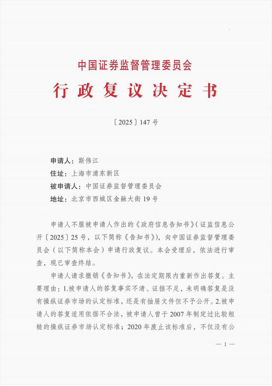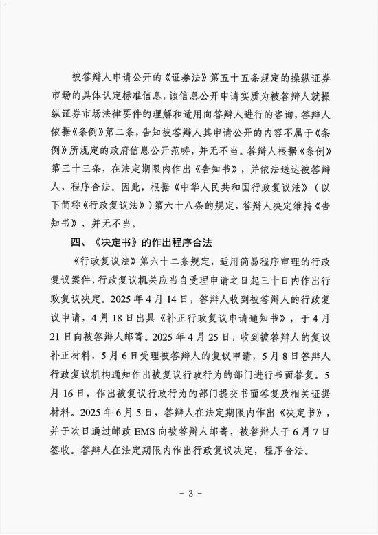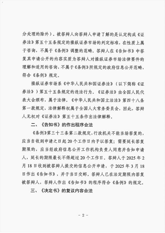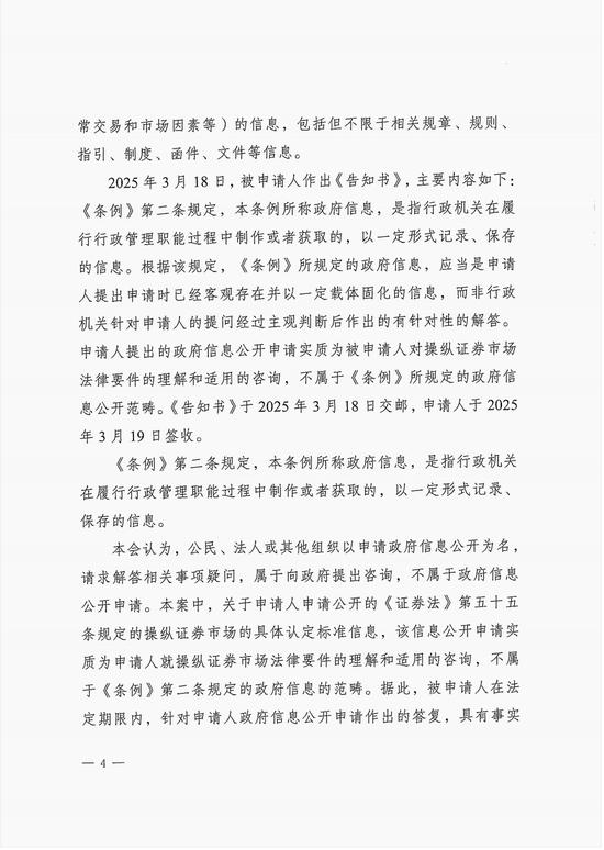2025年6月5日,被告作出“〔2025〕147號”《行政復(fù)議決定書》,認為:“公民、法人或其他組織以申請政府信息公開為名,請求解答相關(guān)事項疑問,屬于向政府提出咨詢,不屬于政府信息公開申請。本案中,關(guān)于申請人申請公開的《證券法》第五十五條規(guī)定的操縱證券市場的具體認定標準信息,該信息公開申請實質(zhì)為申請人就操縱證券市場法律要件的理解和適用的咨詢,不屬于《條例》第二條規(guī)定的政府信息的范疇。據(jù)此,被申請人在法定期限內(nèi),針對申請人政府信息公開申請作出的答復(fù),具有事實和法律依據(jù),并無不當。”決定維持被告作出的《政府信息告知書》(證監(jiān)信息公開〔2025〕25號),并指出申請人不服本復(fù)議決定,可在收到本復(fù)議決定書之日起15日內(nèi)向有管轄權(quán)的人民法院提起訴訟。