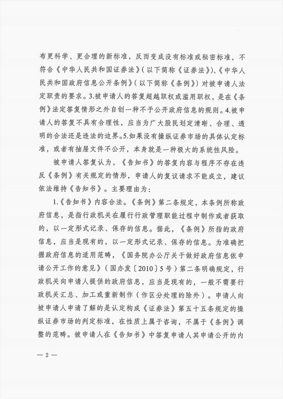 二、被告的答復(fù)適用法律法規(guī)錯誤。被告2007年曾制定過比較粗糙的操縱證券市場認定標準,該標準2020年被廢止后,不僅沒有公布更科學(xué)、更合理的新標準,反而變成沒有標準或者秘密標準。不進步,反退步,不符合《證券法》、《政府信息公開條例》對被告法定職責的要求。