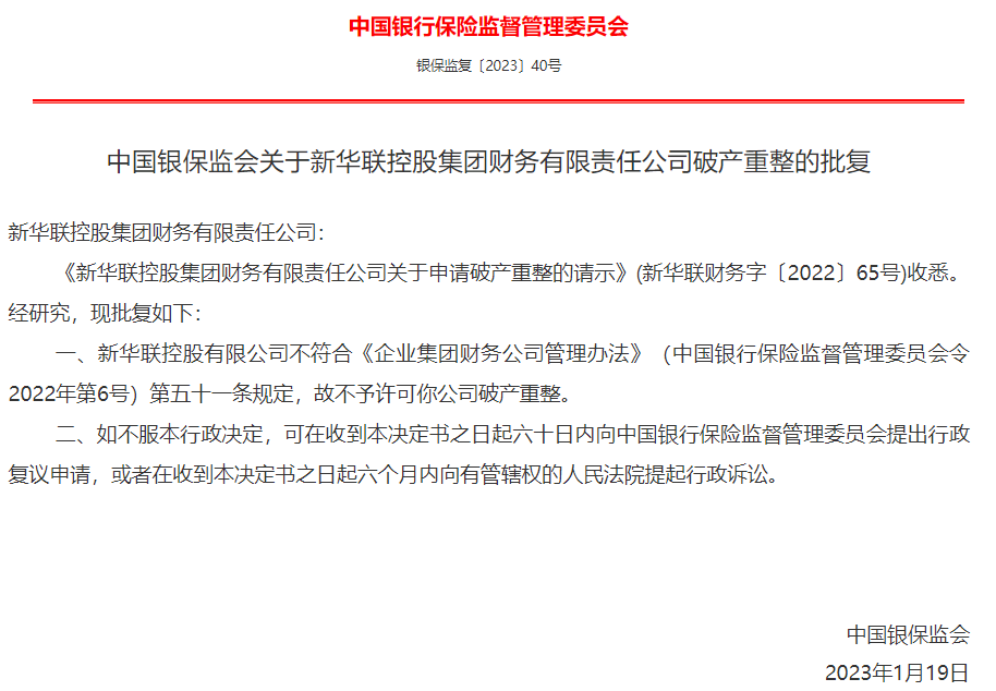 1月19日,中國(guó)銀保監(jiān)會(huì)網(wǎng)站發(fā)布《關(guān)于新華聯(lián)控股集團(tuán)財(cái)務(wù)有限責(zé)任公司破產(chǎn)重整的批復(fù)》,不予許可新華聯(lián)控股集團(tuán)財(cái)務(wù)有限責(zé)任公司破產(chǎn)重整。